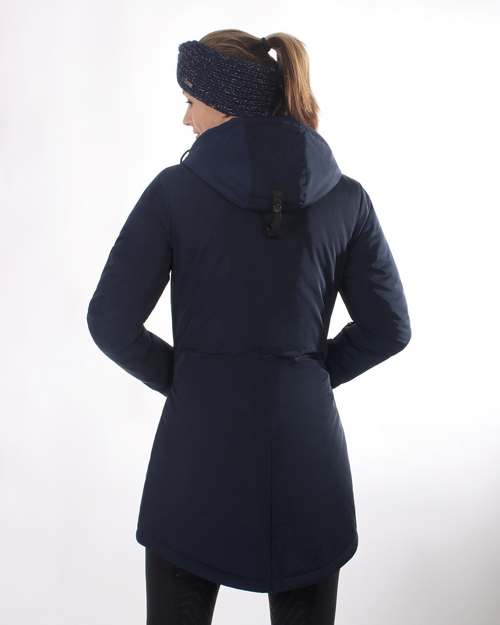 Met deze lange gewatteerde jas trotseer jij de koude winterdagen met gemak. De achterkant bevat een rits zodat deze open te ritsen is wanneer je op het paard stapt. De jas sluit altijd mooi aan door het trekkoord bij de taille, heeft elastische mouwafsluiting en de capuchon kan worden vastgezet tijdens het rijden.