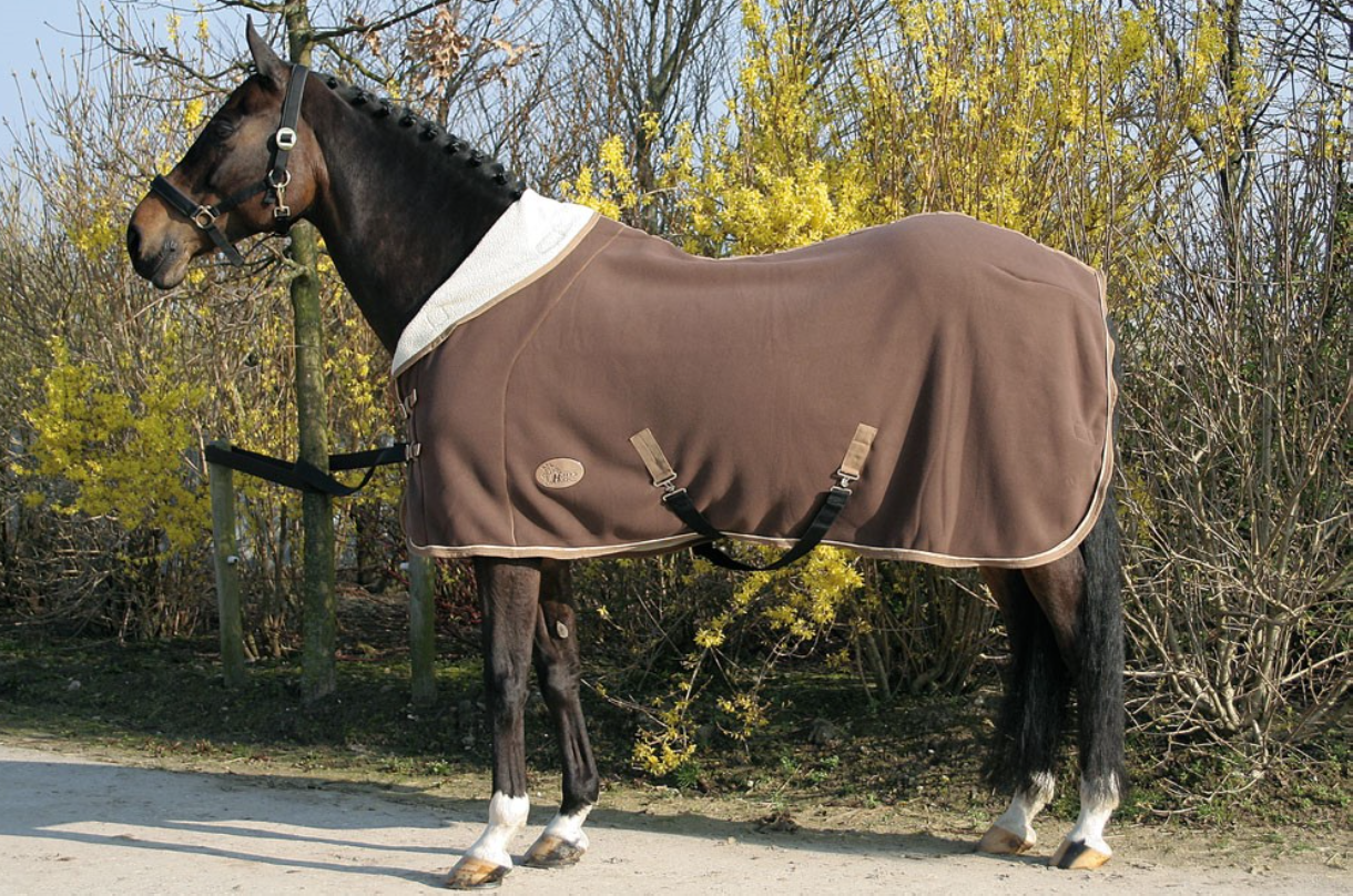 materiaal: 100% polyesterteddyfleece deken met halve hals die teruggeslagen kan worden. buitenzijde fleece en boa fleece (vacht) aan binnenzijde. voorzien van dubbele borstsluiting; vaste kruissingels; afneembare en deels elastische bilkoorden.