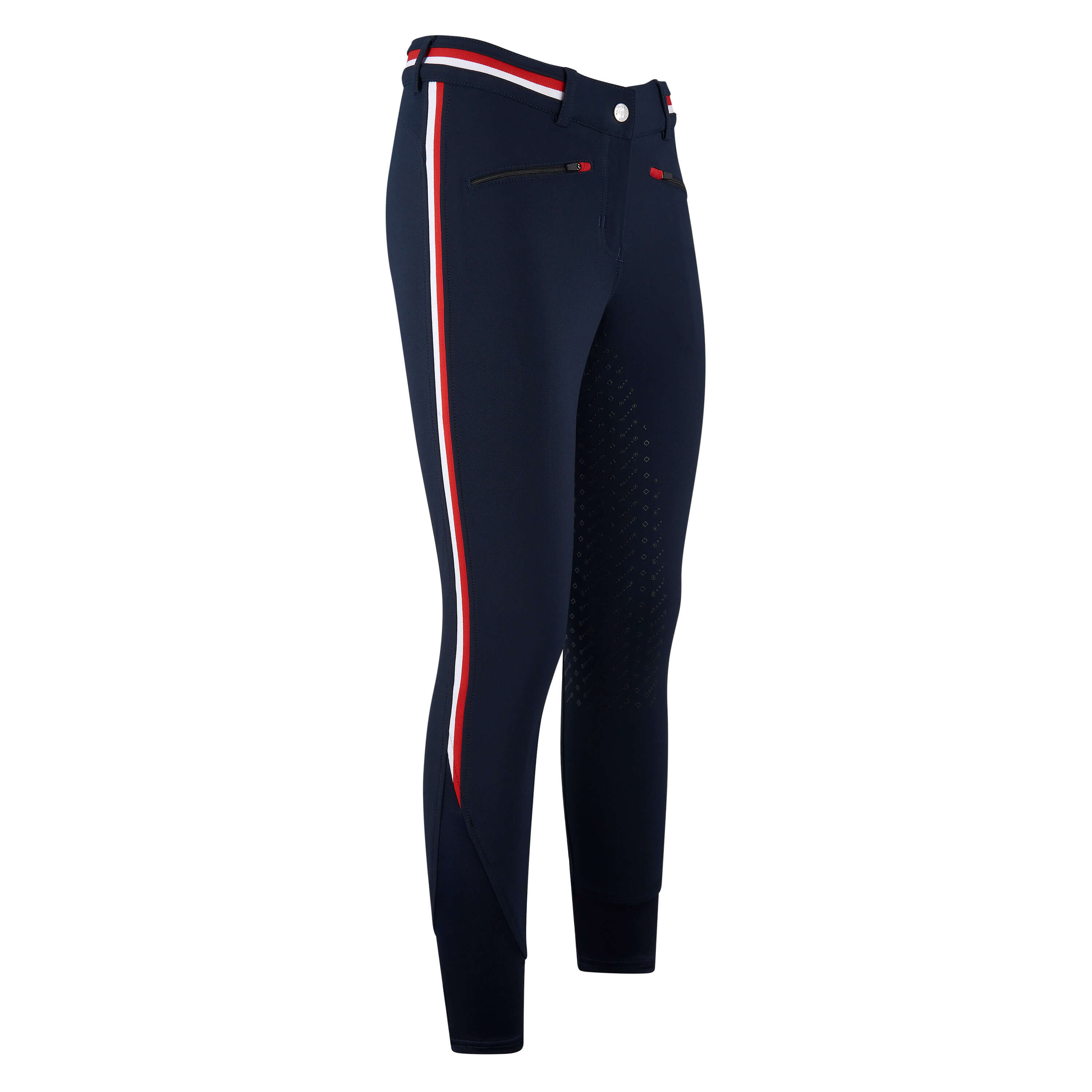 De sportieve en elegante Fran damesrijbroek met stoere driekleurige look is een echte blikvanger. De tailleband heeft riemlooks en heeft tweekleurige contraststrepen die horizontaal zijn aangebracht. De gepolijste knop met gravure bevindt zich aan de voorkant. De zakken aan de voorkant zijn enigszins horizontaal aangebracht en kunnen worden afgesloten met een rits. Met ritsgarages in een contrasterende kleur. Er is een tweekleurige contraststrook verticaal aan de buitenkant van de benen, van heupniveau tot de schacht. De zitvlak van deze rijbroek is gemaakt van siliconen en is aangebracht in een elegant stippen-en-vierkantenpatroon. De speciale beenuiteinden voorkomen dat de broekspijpen in uw rijlaarzen wegglijden.