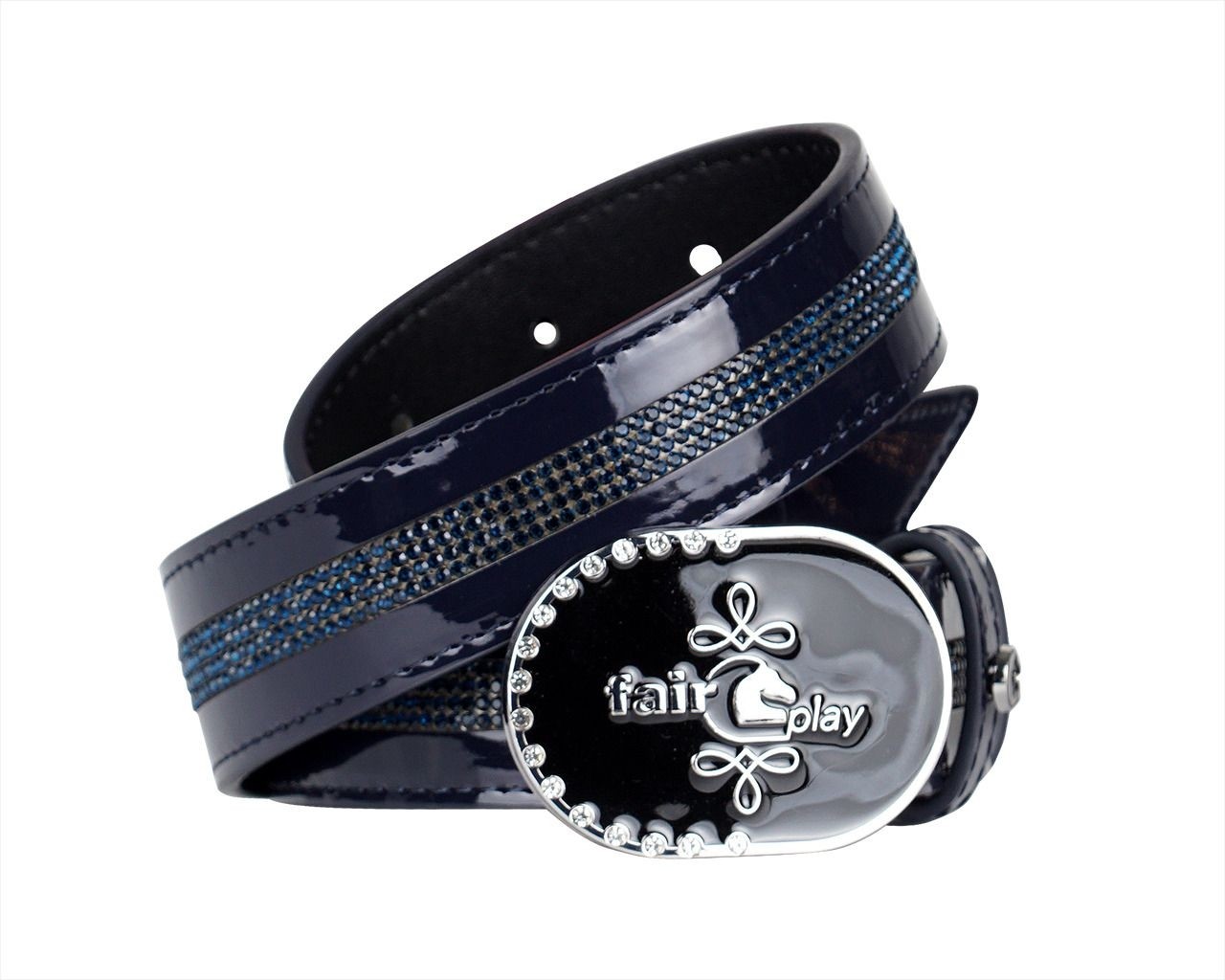Deze elegante en soepele riem is gemaakt van hoogwaardig synthetisch leer en is verfijnd afgewerkt met subtiele, ton-sur-ton kristallen (vintage gouden kristallen in de vintage gouden uitvoering). De charmante gesp is voorzien van het Fair Play-logo, wat de riem een stijlvolle en exclusieve uitstraling geeft.